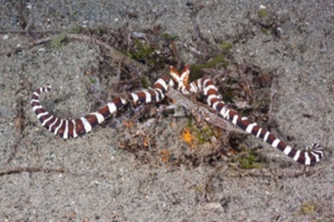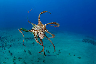 伪装大师 上一秒它还是比目鱼,下一秒就变成了海蛇——形变多变的拟态章鱼(Thaumoctopus mimicus)也能模仿海葵、水母和狮子鱼。虽然章鱼的伪装通常只涉及皮肤,但拟态章鱼学会了模仿其他物种的一系列动作。它会像海蛇一样抬起和卷曲腕足,或者像比目鱼一样蠕动,这很可能是防御捕食者的策略。