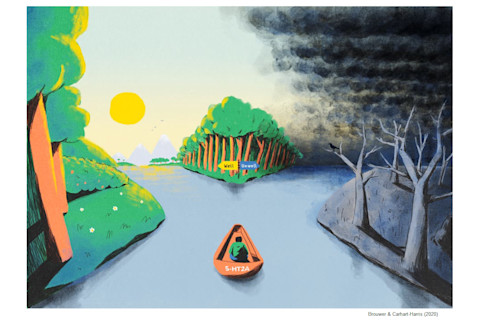 Brouwer 和 Carhart-Harris 用一幅相当优美的艺术作品来说明“关键心理状态”这个“决定时刻”的概念,画中一个人朝两个方向前进,一个方向是阳光明媚的健康,另一个方向是阴沉的疾病。