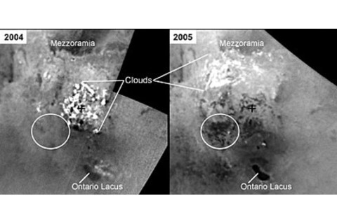研究人员比较了 2004 年 7 月和 2005 年 6 月拍摄的图像,发现了低云和新形成的代表碳氢化合物湖泊的暗区。但从泰坦浓密的大气中降落的甲烷的来源仍然是个谜,因为甲烷应该很快被紫外线辐射分解。