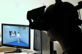 在巴塞罗那的实验室里,人类参与者戴上高清护目镜,通过化身或数字替身来观察虚拟竞技场。当他转动头部时,他的化身也会转动;他可以使用手持遥控器向前和向后移动他的替身。