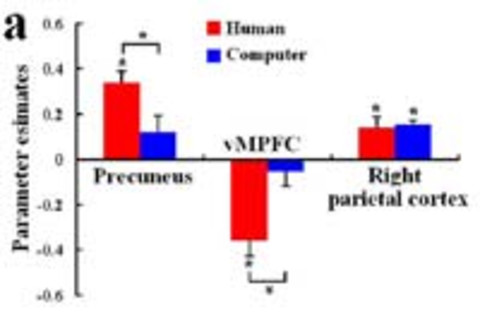他们发现,观看人类的学生在楔前叶(precuneus)表现出更高的活动;其他研究表明,大脑的这一部分参与理解他人的视角。扫描还显示,腹内侧前额叶皮层(vMPFC)的活动有所下降,该区域有助于将新信息与我们自己的经历进行比较。这两种反应与其它研究结果一致,这些研究表明我们通过模拟他人的想法来理解他人的心态,同时抑制我们自己的视角,以免它干扰我们的推理。