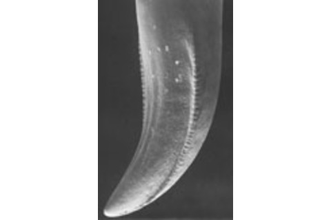 这颗长约一英寸的 *Masiakasaurus knopfleri* 的前牙更适合刺杀而不是切割。