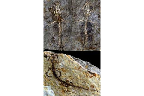 中国古代蝾螈的宝库包括幼体(上)和成年骨骼(下)的化石印痕。摄影:Mick Ellison/芝加哥大学提供