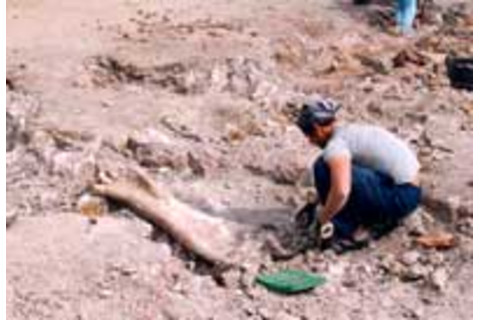 野外研究员 Matthew Lamanna 正在协助挖掘重达 400 磅的 *Paralititan stromeri* 的左肱骨。