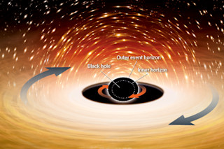 那么,这项工作——其中大部分在《物理学评论D》的一篇论文中有所描述——揭示了克尔黑洞的内部情况呢?与非旋转的黑洞一样,克尔黑洞也有一个中心奇点和一个看不见的事件视界——一个物质和能量永远无法逃脱的球形“不归点”。但是,与静止的黑洞不同,旋转的黑洞还有一个“内视界”——第二个球形且看不见的“不归点”,位于事件视界和中心奇点之间。黑洞旋转得越快,内视界就越靠近事件视界。