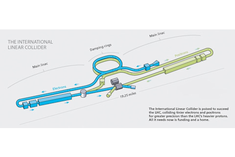 最主要的候选者是一个名为国际直线对撞机的项目。国际直线对撞机将从 19 英里长的直隧道的两端发射电子及其反物质对应物——正电子,在机器中心产生碰撞。通过使用电子和正电子束而非较重的质子,国际直线对撞机将使物理学家能够比在大型强子对撞机中更精确地探测粒子特性。