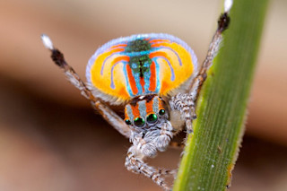那是一只雄性Maratus volans,当时它只是七种已命名的孔雀蜘蛛之一。孔雀蜘蛛是澳大利亚特有的,属于最大的蜘蛛科——Salticidae(跳蛛)。它们是活跃的捕食者——也就是说,它们会猎捕而不是在网上缠住猎物。跳蛛很容易通过它们一对朝前的眼睛来辨认,而孔雀蜘蛛则以其戏剧性的腹部和求偶展示而著称。