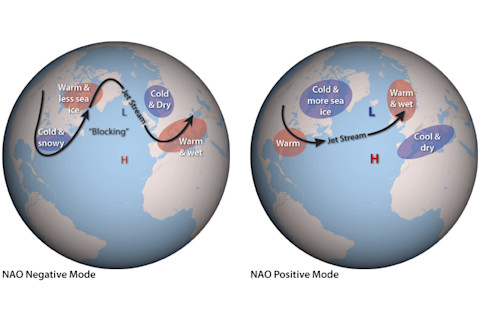 图片由NOAA提供。当寒冷的天气席卷美国大部分地区之际,而严酷的冬季天气使西欧大部分地区瘫痪,挪威特罗姆瑟——位于北极圈以北——的最高气温却达到了近40华氏度。并且还在下雨。我对此深知,因为我此刻正在特罗姆瑟参加北极前沿会议,讽刺的是,该会议部分内容就是关于气候变化的。组织者分发了——是的,你猜对了——雨伞。这个现象的简单解释当然是复杂的——并且尚未完全理解。我们认为是怪异的天气,确实是时常发生的事情。而在冬季,导致这种现象的一个因素是被称为北极涛动的现象。目前它处于负相。通常情况下,这意味着海平面上的大气压力比正常情况下的北极中部要高。同时,它在中纬度地区则低于正常水平。这种模式倾向于为北极部分地区带来相对温暖的温度,并为欧洲和北美带来寒冷的北极空气。