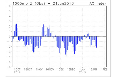 自1月份以来,北极涛动指数——衡量北极地区大气状态的指标——已经转为负值。当这种情况发生时,北极高纬度地区的大气压力倾向于增加,而在更南部的北大西洋中部,它则倾向于降低。但可能还有更多因素在起作用。我的科学写作同事Andrew Freedman在Climate Central上发表了一篇精彩文章,讨论了一个被称为“平流层突然增温”的现象,该现象与北极涛动密切相关。正如他上周晚些时候所写: