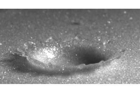 如果你想象每一滴雨都是一颗微小的陨石,正在威胁着微型恐龙,或者将小小的宇航员本·阿弗莱克送入太空,那么雨天将变得更加戏剧化。事实证明,除了最后一部分,你的想象并没有离谱太远。研究人员发现,小行星撞击形成的陨石坑与雨滴在沙子上留下的短暂凹痕之间存在惊人的相似之处。在明尼苏达大学,物理学家 Xiang Cheng 和三名本科生仔细研究了水滴撞击颗粒表面的情况。由于这类碰撞中的变量众多——液体的粘度、水滴撞击表面时挤压的程度、液体与颗粒的相互作用——研究人员称之为“极其复杂”。Cheng 和他的学生利用高速摄影和激光测量来观察下落的水滴以及它们形成的微型陨石坑。他们使用沙子状的玻璃颗粒而不是真正的沙子。在这片不浪漫的海滩上,他们滴下了各种大小的水滴,模拟了天然雨滴。为了产生最小的撞击,他们将水滴从距离表面不到 2 毫米的高度滴下。其他水滴则从高达 12 米的高度滴下。resulting 慢动作电影揭示了水滴溅落瞬间的奇怪而惊人的现象。雨滴是雕刻家,在它们身后留下了新的沙子地貌。它们具体创造出什么,取决于它们撞击的力度。例如,低能量的水滴会散开并抓住沙粒,然后弹回形成一个“液体球”。这个沙质球甚至可能在雨滴的尾迹中从地面跳起。