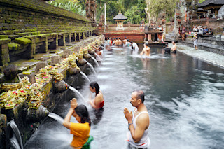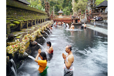 巴厘岛人在圣泉寺神圣的泉水中沐浴。这些水也灌溉着佩拉西的苏巴克。| XPacifica/Corbis