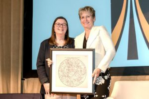 惠特森从阿德勒天文馆馆长兼首席执行官米歇尔·拉尔森手中接过“太空科学女性奖”。(图片来源:阿德勒天文馆提供)
