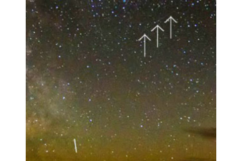 [点击放大。]。多么棒的一张照片!我尝试过拍类似的照片,但从来没有成功过一张像这张一样好的。这需要黑暗的天空;兰迪拍摄时离南达科他州苏瀑约 300 公里以西,那里几乎没有光污染。银河系清晰可见;你可以看到星系中心区域的隆起,以及向画面顶部逐渐变细的盘面。这样的照片总是提醒我们,我们生活在一个巨大的螺旋星系的中层平面。当兰迪拍到这张照片时,国际空间站正从西南地平线上升起。100 米宽,380 公里高,速度为 8 公里/秒,空间站反射大量阳光,并且移动速度足够快,在短曝光时间内会形成一条明亮的轨迹……而且足够明亮,在水中形成强烈的反射。一件有趣的事情是:当我仔细看这张照片时,我看到了一个靠近国际空间站的微弱轨迹。你可以在我这里包含的照片中看到它;我已经增加了亮度和对比度,使其更明显,并用箭头标出。