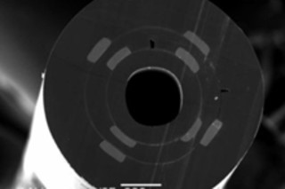 为了测试他们的设备,研究团队从后面照亮了一张笑脸图片,并在前面放了一块未来派织物。纤维测量了到达它们的光线强度,并区分了不同的波长(或颜色);当数据输入计算机时,屏幕上弹出了笑脸图像。研究人员表示,这项技术有朝一日可能会用于军事应用,例如一种可以记录士兵周围所有动作并为他提供 360 度视野的制服。相关内容:《80节拍》:《“世界上最快的相机”一秒钟拍摄 600 万张照片》《发现》:《停止时间》瞥见十亿分之一的十亿分之一秒《发现》:《单个电子被捕获在胶片上》图片来源:Fink 实验室,麻省理工学院。纤维的横截面。