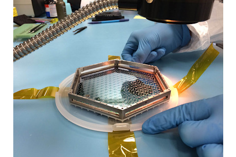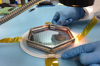 费米实验室的科学家们正在检查将用于升级的南极望远镜的光学探测器。| Bradford Benson/University of Chicago/Fermilab