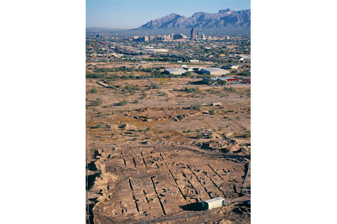 这张1999年10月拍摄的照片显示了亚利桑那州朱利安洗溪遗址的挖掘现场,远处是图森市中心和圣卡塔利娜山脉。该遗址最初被认为是可能的垃圾堆,现在被认为是公元750年至1150年间的一个大型霍霍坎村落,是保护考古的一个典范,在这种考古学中,遗址的挖掘和保护与开发同步进行。