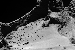 67P比其他同类彗星含有更多的有机物——这对我们这些离不开有机分子的生命体来说是一个重要的发现。像67P这样的彗星可能将最终形成我们的碳基分子带到了地球。而这些彗星告诉我们,有机分子在太阳系中存在多久了:甚至在太阳还不是真正的恒星之前就已经存在了。在那早期时期,还有水、甲烷、甲醇、二氧化碳、一氧化碳——其中一些是罗塞塔号在67P上看到的冰,也是我们生命和地球宜居性所赖以存在的同类化合物。我们并不真正把彗星当作世界。但它们是,而且它们是我们世界所由构成的世界。如果我们想象彗星,我们会想到天空中模糊的条纹,或者图像中雄伟的彗尾。但罗塞塔号将67P变成了一个地方——一个有风吹过、尘埃沉降的地方,如果你掉进15英尺深的尘埃堆里不会死的话,你可以在那里进行一些很棒的攀岩活动。