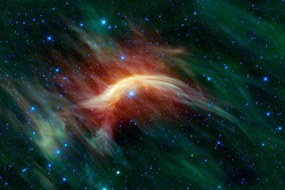 天鹰座 Zeta,在此红外图像的中心被看作一个蓝点,是一颗距离我们约 366 光年的快速移动恒星,它在其前方推动着一个超热气体的恒星弓形激波。红色对应温度较高,绿色对应温度较低。(资料来源:NASA/JPL-Caltech/UCLA)恒星会奔跑,但它们无法隐藏。来自 NASA 的 WISE 和斯皮策望远镜的数据显示,快速移动的奔跑恒星在穿越太空时,会在前方推动一大团超热气体,形成一条明亮的弧线,暴露它们的位置。这些发现本周在美国佛罗里达州基西米举行的美国天文学会(American Astronomical Society)第 227 次会议上公布。科学家希望利用这些“弓形激波”来定位和研究银河系中逃逸的恒星。
