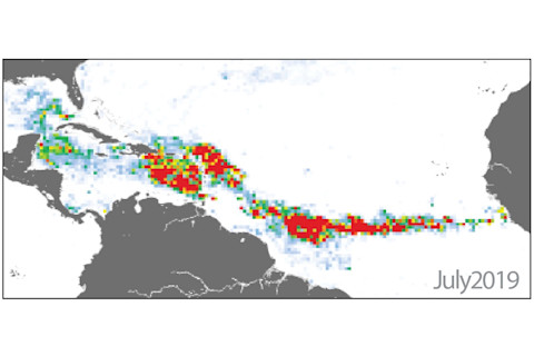 自至少2011年以来,这种气味难闻的马尾藻一直在大西洋上形成巨大的垫子——并冲上岸——每年夏天都如此。研究人员于2019年7月发表了关于这种棕色藻类的第一份完整报告,当时这个藻带仍然很强劲。(图片来源:Mengqiu Wang)