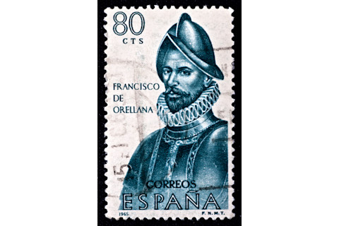 一张西班牙邮票,显示了 Francisco de Orellana。(来源:Marques/Shutterstock)