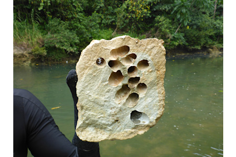 一块由新型海笔虫在石灰石上造成的孔洞。(图片来源:Marvin A. Altamia and J. Reuben Shipway)