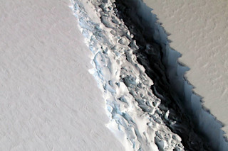 一道长达 80 英里的裂缝正在南极半岛的拉森 C 冰架上蔓延。一旦裂缝延伸到海洋,它就会崩解出一块特拉华州大小的冰山。几个月前,这块冰似乎就有可能断裂,但它仍然仅靠着约 10 英里的“丝线”悬挂着。本周早些时候,监测拉森 C 的 MIDAS 项目的科学家报告说,裂缝出现了一个新的分支。