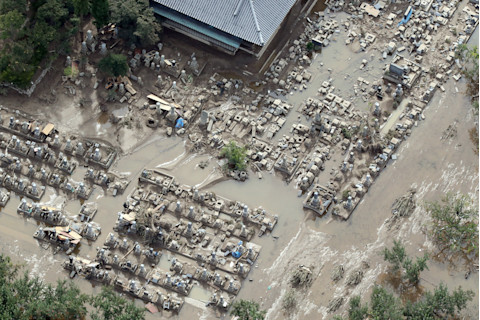 台风海贝思席卷长野市后,泥浆覆盖了墓碑(图片来源:光雪太贺)。