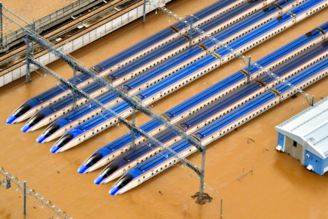 台风海贝思引发的降雨导致附近河流决堤,一个火车车库被淹没。这场风暴在日本造成大范围洪水,导致 80 多人死亡(图片来源:朝日新闻 via Getty Images)。