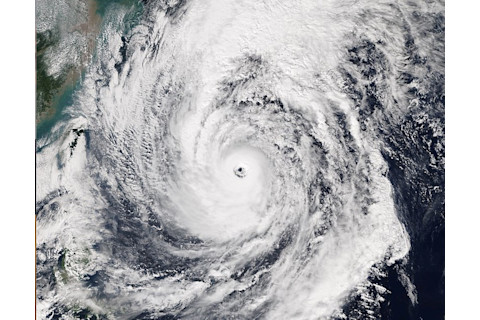 科学家们可以使用名为投落探空仪的导弹形传感器从台风兰等风暴中捕获数据(图片来源:美国宇航局/兰斯/Modis)。