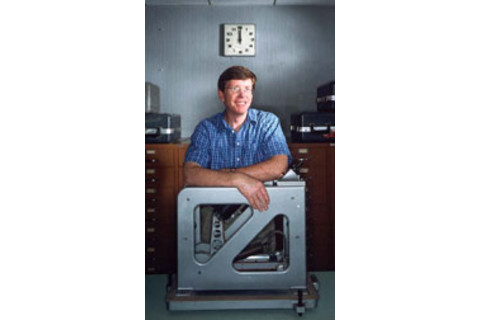 特里·华莱士和一台经典的贝尼奥夫地震仪,现已退役。背景中,便携式地震仪堆叠在装满历史地震图的柜子上,等待外勤任务。