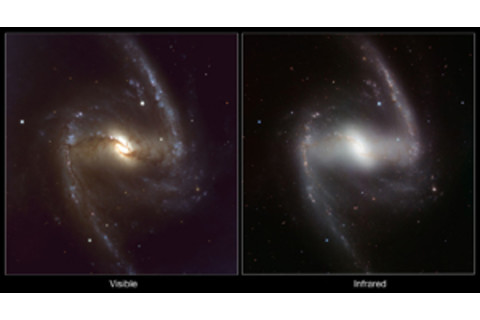 对于横杆也是如此。那是穿过星系中心的细长、水平、相对笔直的特征。那是某些星系中引力的自然结果,事实上,我们现在很确定银河系是一个棒旋星系,尽管我们的横杆不像 NGC 1365 中的那样突出。在这里的并排图像中(点击它以获得更大的图片),星系的可见光在左侧,红外图像在右侧。尘埃更能阻挡可见光,所以您可以看到尘埃所在的位置……而且,又一次,横杆上布满了尘埃。同样,这也很合理,因为我们看到了那里大量的恒星形成。有趣的是,NGC 1365 的中心核呈拉长状,并且与横杆成一定角度。那个核主要由年老、更红的恒星组成——这就是为什么它在红外图像中如此突出。那些恒星会发出红外光。但它也缺乏尘埃和气体(图像非常平滑,表明它是数十亿颗恒星的综合光;气体和尘埃会使其像横杆和旋臂一样斑驳)。这是另一个表明它很老的迹象;所有气体早就被用来制造恒星了。通过简单地比较在不同波长下拍摄的两张图像,就可以了解一个星系,这真是太神奇了。但这几乎是天文学家近一个世纪以来都知道的事情;我们用眼睛看到的一切都远远不是全部故事,只有超出我们的自然限制,我们才能真正理解宇宙。如果这有什么道德教训,我留给您去弄清楚。