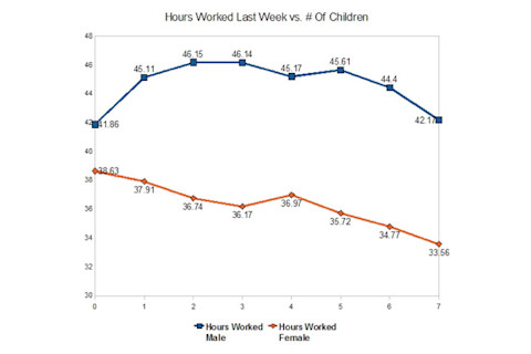Science bloggers are still abuzz over Wednesday's discussion of women in academia and now Razib (one of my very favorite sciblings) has taken the topic one step further. He collected data on the mean number of hours worked last week broken down by sex and compared that with the number of children per individual. I always enjoy reading Razib's amusing analyses ( and justified reason to link greatflicks from the 80s ): As you can see, the more children women have, the fewer hours they worked last week (on average). Women are primary care givers, no surprise. On the other hand, you can see a different trend for males. I suspect that reflects the reality that losers can't find mates.