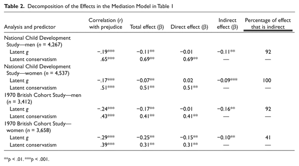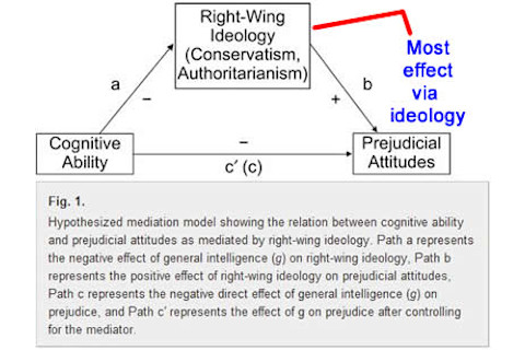 上表代表了英国群体和种族的结果,左边的图表说明了美国样本和同性恋的结果。主要观点是,正如他们的假设,较低的认知能力对种族和其他同性恋的偏见效应或多或少是通过意识形态来中介的。粗略地说,愚蠢的人不是种族主义者,愚蠢的人更有可能是社会保守派,而更社会保守派的人更有可能是种族主义者。然而,这些联系在一起的方式可以受到更批判性的审视。作者在提到一个发现时暗示了这一点,即那些认识不同种族的人往往偏见较少,其推论是接触使人less racist。但这并非确定的因果关系。相反,可能是那些偏见倾向较低的人把自己置于可能遇到其他种族的环境中。这种倾向可能通过“国际化指数”的中介与较高的智商相关。谁知道呢?有很多种可能性。