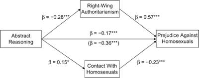 尽管认知能力对人际行为和关系有着重要的影响,但认知能力在解释偏见方面却在很大程度上被忽略了。我们提出并测试了中介模型,其中较低的认知能力预示着更大的偏见,这种效应通过对右翼意识形态(社会保守主义、右翼威权主义)的认同和与外群体的接触水平低来中介。在对两个大规模、全国代表性的英国数据集(N = 15,874)的分析中,我们发现童年时期较低的总体智力(g)预测成年期更大的种族主义,并且这种效应很大程度上通过保守意识形态来中介。对一个美国数据集的二次分析证实了不良的抽象推理能力对反同性恋偏见的预测作用,这种关系部分通过威权主义和低水平的群体间接触来中介。所有分析都控制了教育和社会经济地位。我们的研究结果表明,认知能力在偏见中起着关键作用,尽管未被充分认识。因此,我们建议在偏见研究中更多地关注认知能力,并更好地将认知能力整合到偏见模型中。