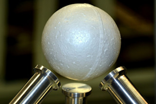 安德拉德的团队没有使用两个声源来产生声音,而是使用了三个超声波换能器,呈三脚架状排列。这种设置在球体和换能器之间产生了一个驻波,在将物体升高的同时将其固定在原位。