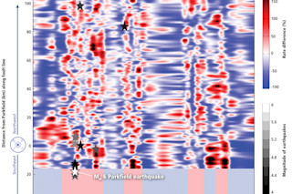 下图显示了在加州帕克菲尔德附近断层直接沿线的粘滑运动,帕克菲尔德是SAFZ中部地区的一个定居点,2004年曾发生过6级地震。蓝色信号表示低于正常运动的时期,红色表示高于正常运动,黑色表示最强烈。然而,这种增强的活动并不总是会导致地震。例如,在2006年中期和2008年末至2009年初,触发帕克菲尔德事件的同一断层区域也出现了另一次显著的粘滑爆发,但没有发生全面地震。
