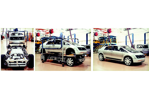 概念展示 Hy-wire的11英寸厚的铝制“滑板”平台(左)集成了三个碳复合材料制成的高压氢气罐、200个串联的燃料电池和一个带有集成电源电子设备的三相异步电动机。安装新的车身(中)只需要几分钟。轿车外壳(右)可以很容易地更换,例如,换成皮卡卡车外壳。这种易于互换性将使通用汽车和公众受益,分布式发电解决方案总监Timothy Vail说。“今天,通用汽车在50个平台上拥有68款车型。如果我们能生产大约三个滑板平台——小型、中型和大型——这将降低我们的结构成本。”然后公司可以专注于制造各种专业车身来服务利基市场,Vail说。