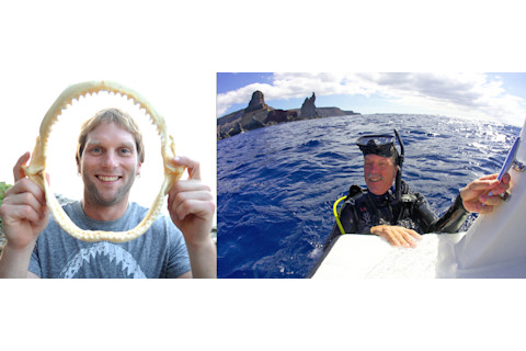 泰勒·查普尔(左)在他位于俄亥俄州洛兰的家中拿着墨西哥湾的沙洲鲨鱼颚骨。他想证明鲨鱼在导航中使用磁场,但首先需要找到一些鲨鱼。传奇海洋生物学家彼得·克利姆利(右)在墨西哥西海岸雷维拉希赫多群岛的鲨鱼研究之旅中浮出水面换气。| 史蒂夫·曼海姆/伊利里亚纪事电报;马克·弗拉普威尔