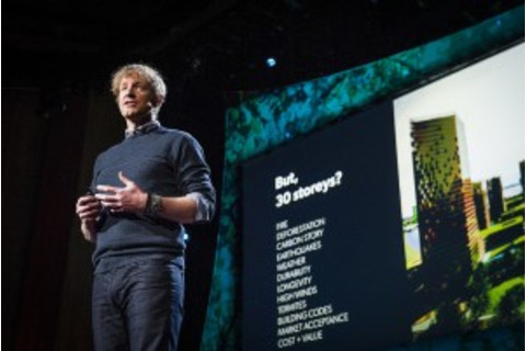 建筑师迈克尔·格林在 TED2013 上。加拿大建筑师 迈克尔·格林 正从一个不同的角度着手解决经济适用、可持续住房问题:他正在以一种新的方式使用历史上最传统的建筑材料之一。“木材是我能建造的最具技术先进性的材料。碰巧大自然拥有这项专利,”格林在周三的演讲中说道。格林正在设计高达 30 层的木制摩天大楼,并相信这甚至不是这种材料的上限。在他演讲后的谈话中,他承认关于他偏好的材料,他听到的最常见的担忧是对森林砍伐增加的恐惧。格林指出德国和波兰繁茂且管理良好的森林,认为解决方案是选择性地砍伐生长周期快的成熟树木,不仅创造可持续的建筑材料供应,还能促进更健康的森林。“我有孩子,”格林说。“我想做正确的事。我想为他们,也为地球做正确的事。”年度 TED 会议今年已迎来第 29 届,其特色是来自不同学科的演讲者,就技术、娱乐和设计领域的创新和想法发表简短演讲(时长 4 到 18 分钟)。演讲者和听众拥有广泛的国际化经验,包括著名的科学家、远见卓识者、名人、艺术家、风险投资家和企业领导者。