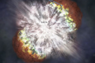 [首席研究员杰夫]库克说:“当它们接近死亡时,这些恒星会向太空抛射物质层,在它们周围形成壳层。当它们爆炸时,所有物质都会从中心尖叫着冲出来,撞击到那个壳层。”这个动作加热了壳层,使其在爆炸后多年仍然发出明亮的光芒[《国家地理新闻》]。