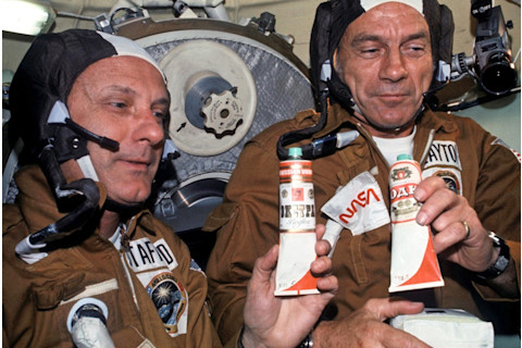“阿波罗-联盟号”任务的宇航员托马斯·斯塔福德和迪克·斯莱顿拿着标有“伏特加”的管子(但实际上是罗宋汤)。NASA