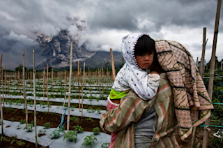 2014年1月4日,在印度尼西亚北苏门答腊省卡罗地区,一位妇女抱着她女儿走过附近的田野,而西那朋火山正在喷发火山灰和碎片。摄影:Ulet Ifansasti/Getty Images