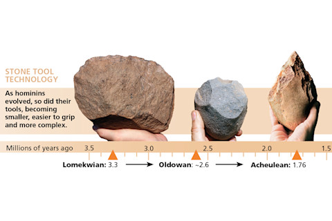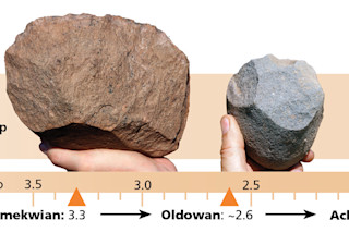 到目前为止,最古老的已知石器组合是奥尔德万(Oldowan),以 Louis Leakey 在坦桑尼亚北部的奥尔杜瓦峡谷命名。奥尔德万工具曾在非洲东部、南部和中部的遗址被发现;其中最古老的,距今 260 万年,来自埃塞俄比亚的 Gona。平均直径约为 2 至 4 英寸,它们是使用古人类学家称为“徒手”的技术制造的:“自由手”技术:将一块石核握在一只手中,用另一只手中的圆形锤石反复敲击,以剥离出锋利的石片。双手需要协调配合。
