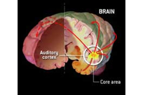 大脑的许多部分都参与了音乐制作。音乐声音在听觉皮层(黄色)处理。然后通路将音乐传输到大脑中执行(绿色)、预测和声和旋律变化(粉红色)、感受和记忆(橙色)以及阅读(蓝色)的区域。基于Mark Jude Tramo在2001年1月5日《科学》杂志上的插图。