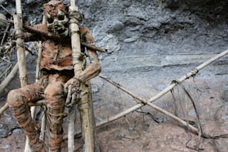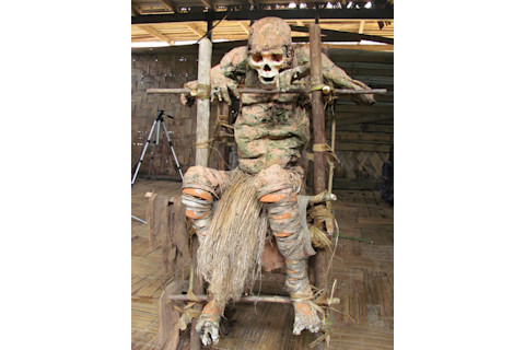 到2008年,一位名叫Moimango的巴布亚村庄领导人的遗体已经风化了几十年,他坐在一处悬崖边上,距离谷底约1000英尺。他位于屋檐下,得以免受降雨侵蚀,但风的侵蚀仍在缓慢地留下痕迹。