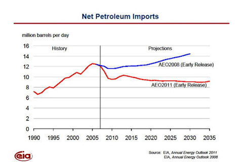 : 上周,参议员杰夫·宾厄姆(新墨西哥州民主党)在一个备受忽视的演讲中(Grist 并非忽视),认为如果美国减少石油使用量(多么令人惊讶!),就能降低石油价格飙升的脆弱性。演讲的核心是他展示的一张关于我国估计石油进口量的图表,特别是2008年至2011年(上图的蓝线和红线)之间预测的显著变化。我们现在不断下降的汽油和石油进口量,部分归因于2007年的《能源独立与安全法案》。究竟是如何做到的