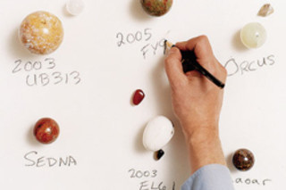 几十年后,布朗和他的同事——双子座天文台的查德·特鲁希略(Chad Trujillo)和耶鲁大学的大卫·拉比诺维茨(David Rabinowitz)——通过发现位于距离太阳100亿英里之外、被称为“柯伊伯带”的碎屑环中的轨道天体,彻底动摇了天文学界。他们给这些冰质天体起了昵称,如“夸奥尔”(Quaoar)、“塞德娜”(Sedna)、“圣诞老人”(Santa)、“复活节兔子”(Easter Bunny)和“塞娜”(Xena)。