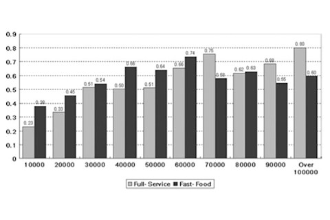 随着收入的增加,快餐消费的频率也随之增加,至少在收入达到6万美元/年之前;而正餐餐厅的消费量则持续上升。(纵轴表示消费频率。)