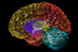 在这里的广角视图中,主要的大脑结构以彩色编码的透明度显示。每个斑点都标记着多巴胺转运蛋白基因 DAT 高度活跃的地方,该基因产生大量将多巴胺吸入神经细胞的蛋白质。
