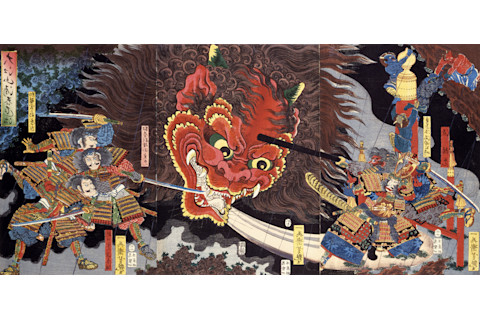 这幅版画来自日本艺术家歌川芳艳(Utagawai Yoshitsuya,1822-1866),描绘了英雄源赖光在其山间巢穴中屠杀巨魔般的酒吞童子。(V&A Images / Alamy Stock Photo)